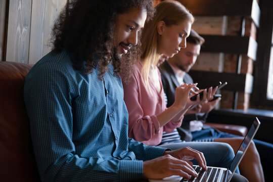 Gadget addiction. Diverse young people sitting on couch in public place involved in using different electronic devices, looking at screens, communicating online, avoiding real life talks conversations