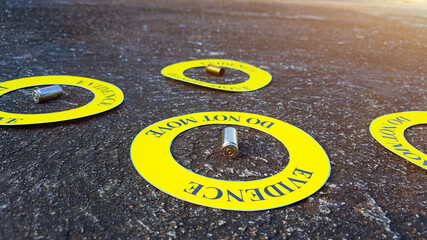 Bullet shell in middle of a yellow circle with text "evidence do not move" the circle on black background, concept for crime scene investigation