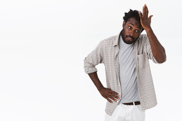 Guy punching his forehead as remember something important that slipped his mind. Awkward and embarrassed african-american man touching head and look aside, avoid eye contact bothered and distressed