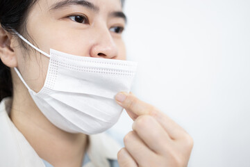 Woman was moving the medical face mask that fell under her nose with fingers or hands,Do not touch the protective face mask while wearing,avoid to prevent Coronavirus from entering the nose and mouth
