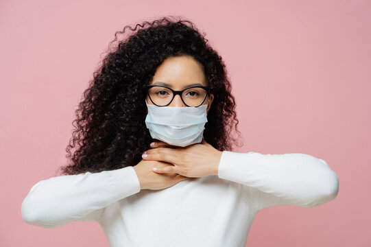 Sick curly haired woman touches neck, suffers from suffocation and shortage of breathing, wears medical mask to avoid virus infection, isolated on pink background. Coronavirus, health care concept