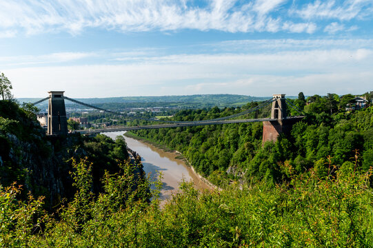 wide angle view of the landmark of Bristol, Clifton Suspension Bridge and Clifton Observatory