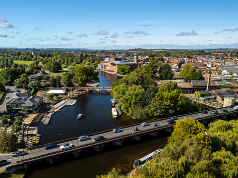 Aerial view of Stratford-upon-Avon showing the River Avon flowing through the town center