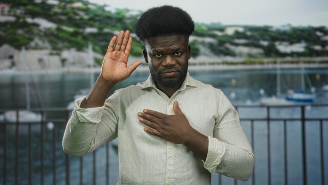 Man with hand on chest and raised palm to camera on street marina with boats and waterfront railing; sincere pledge.