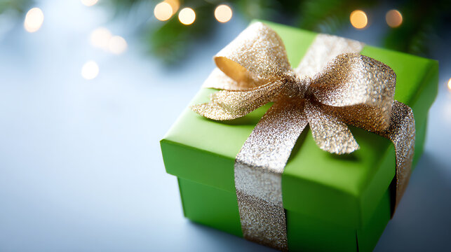 A beautifully wrapped green gift box adorned with a shimmering gold ribbon, perfect for celebrations and special occasions.