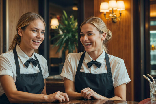 Two happy European waitresses in aprons and bow ties smile at the camera and wait for an order near the bar