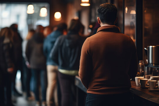 Queue Lot Of People In The Coffee Shop. Сoncept Effects Of Waiting In Line, Benefits Of A Queue System, Busy Coffee Schedules, Benefits Of Breaks At Coffee Shop