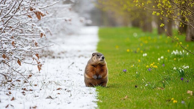 Groundhog emerges from winter snow to greet spring blossoms