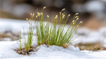 Early spring grass pushing through melting snow in natural landscape. Fresh green blades with seed heads emerging after winter. Seasonal change, renewal, growth and thawing nature concept