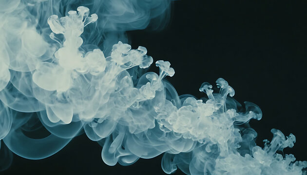 Gumpalan asap biru kehijauan melayang di ruang gelap, tekstur awan dramatis bergaya sinematik untuk latar kreatif