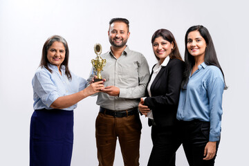 Happy worker team in office holding a golden trophy to celebrate succession of a big project. Business teamwork concept.