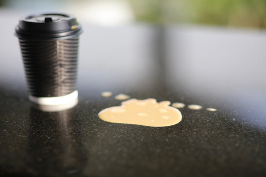 Hot coffee cup and coffee drop on floor repsent the dirt and self clean awarness
