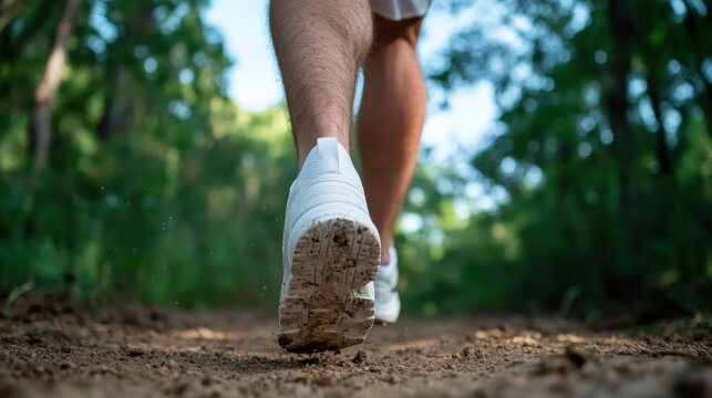 A person walking along a dirt trail surrounded by lush greenery, capturing the essence of adventure, fitness, and a connection to nature in a serene outdoor environment.
