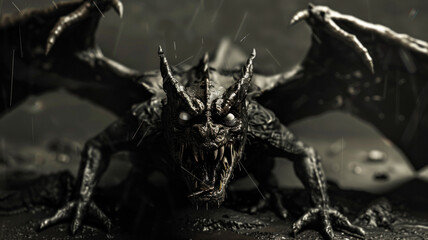 a winged scary demon with horns grins terribly