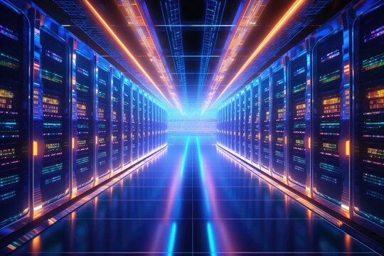 A futuristic data center with rows of glowing servers and a holographic control interface. Generative AI.