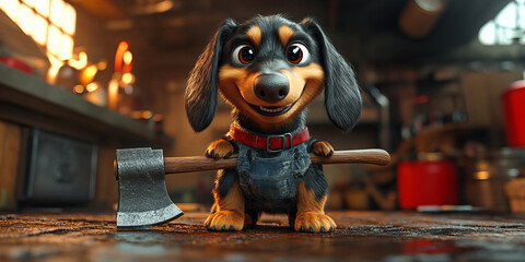 Determined dog with axe in workshop setting, vibrant animation style, warm colors, indoor background, spirited and motivated mood in creative space