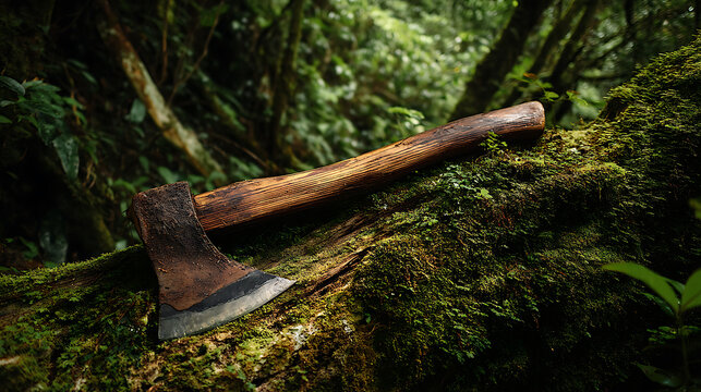 An axe rests on a large moss-covered tree trunk