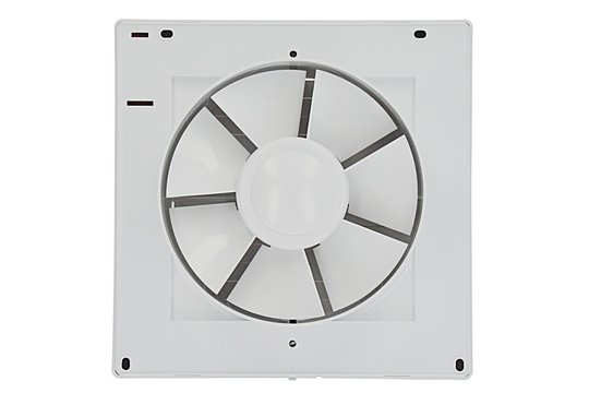Rear side of axial fan used for ventilation of interiors, especially baths and toilettes, white background