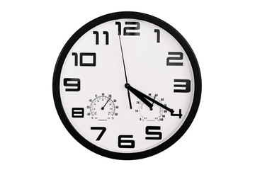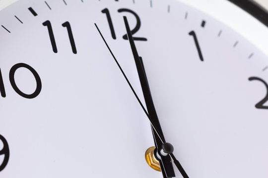 Close up of a ticking clock on white background, pointing a few minutes past midnight, copyspace