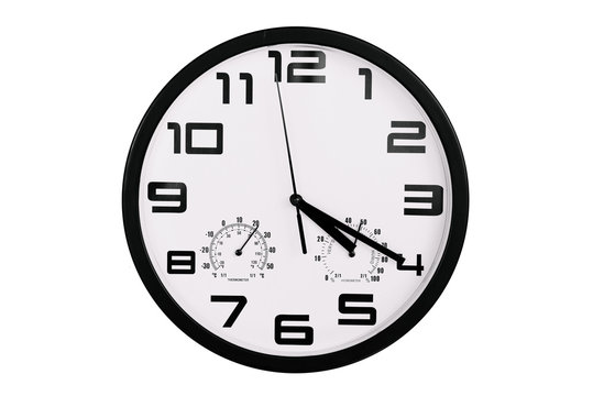 simple classic black and white round wall clock isolated on white. Clock with arabic numerals on wall shows 16:20 , 4:20