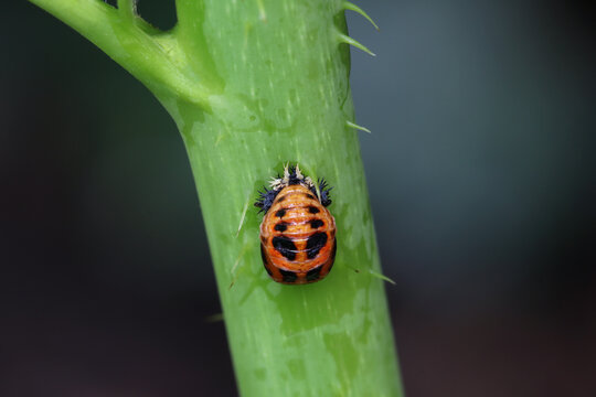 The pupal stage of the ladybug is attached to the stem. The orange pupa with black markings. Organic Pest Control. Aphid predator. Harmonia axyridis, aka the harlequin or multicoloured Asian.