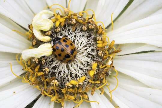 Closeup of an asian ladybeetle (Harmonia axyridis) on a field scabious (Knautia arvensis).
