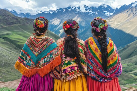 Three women in colorful traditional clothing. The women are wearing brightly colored clothing in a mountain landscape.
