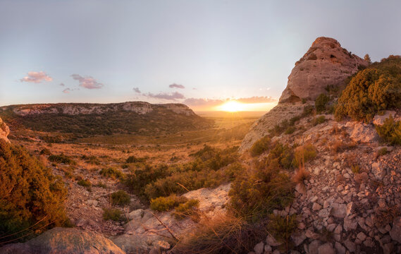 A panoramic view of the sunset. Mountain landscape and meadow at sunset. Sunset on the top of a mountain, from above you can see a valley bathed in sunlight. Ayora, Valencia, Spain