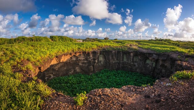 Expansive view of los gemelos sinkhole on Santa Cruz Island, Galapagos, showcasing erosion risk