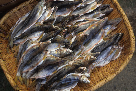 Ayu sweet fish in a market stall in Nishiki fish market in Kyoto, Japan.