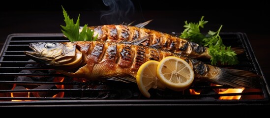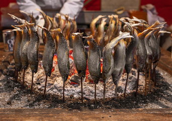 Charcoal grilled. Japanese grilled fish on bamboo stick. Japanese street food.
