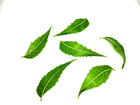 Medicinal neem (Azadirachta indicia) leaves over isolated white background