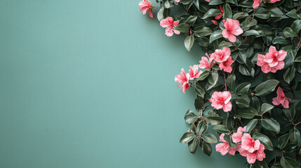 Pink azalea blossoms beautifully cascade down against a serene light green wall, creating a natural and elegant floral design with an organic aesthetic appeal.