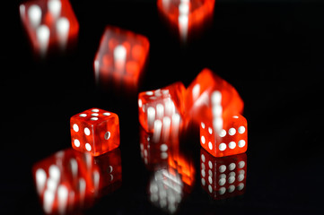 Dados blancos rodados por la mano de una mujer sobre fondo negro – enfoque selectivo.