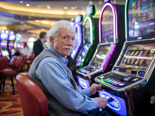 Anciano sentado en una colorida máquina tragamonedas en un casino