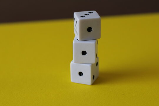 Una toma de cerca  de uno o varios dados blancos para juego en un fondo amarillo