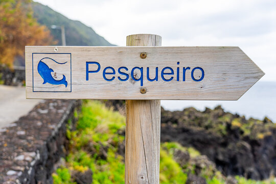 Fishing direction sign made of pine wood with a drawing of a fish with azole in its mouth in Fajã das Almas next to the sea. São Jorge Island-Azores-Portugal