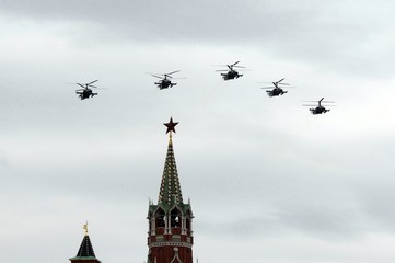 A group of reconnaissance and attack helicopters Ka-52 Alligator (Hokum B) fly in the sky over Red Square during an air parade dedicated to Victory Day in World War II