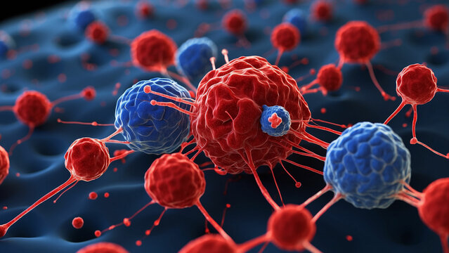 3D medical illustration of lymphocytes and immune system components. Abstract microscopic view showing immune defense cells, biology concepts, and immunology research visuals.