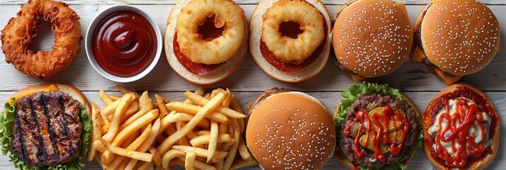 Assortment of delicious fast food including burgers, fries, onion rings, and dipping sauce, perfectly arranged on a wooden table.