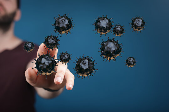 Hand reaching towards virus particles floating in the air. Healthcare concept. Digital virus illustration on b