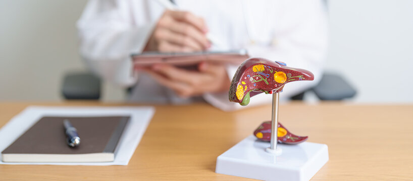 Doctor with human Liver anatomy model. Liver cancer and Tumor, Jaundice, Viral Hepatitis A, B, C, D, E, Cirrhosis, Failure, Enlarged, Hepatic Encephalopathy, Ascites Fluid in Belly and health concept