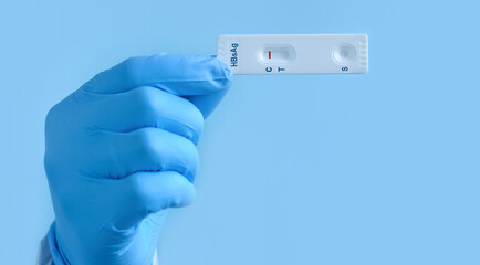 Doctor's hand in medical gloves holding Rapid test cassette for Hepatitis B Virus Test (HBsAg).Test shows a negative result. Copy space