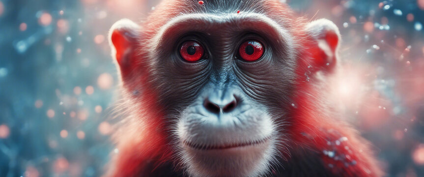 Close-up of a monkey surrounded by mpox virus particles The background is a combination of red and b