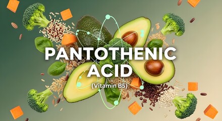 Pantothenic Acid (Vitamin B5) displayed with nutrient-rich foods: avocado, broccoli, sprouts, carrots. Healthy diet.