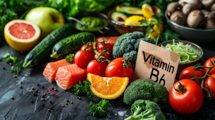 Assorted fresh vegetables, salmon, and a vitamin B6 sign on a dark background. Healthy eating and nutrition concept. Banner with copy space