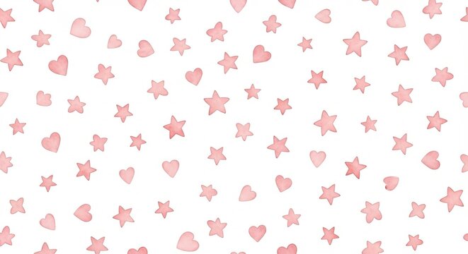Watercolor pattern featuring pink hearts and stars scattered on a white background in a random design