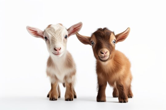 photograph of Two funny baby goats playing on a white background