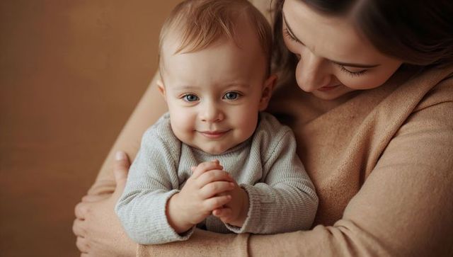 Mother cradling smiling baby in cozy knit sweaters showing tender bond and warmth