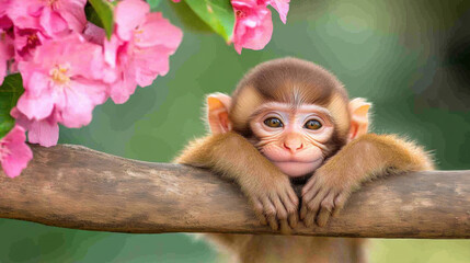 Adorable baby monkey with floral hat in bright outdoor setting
